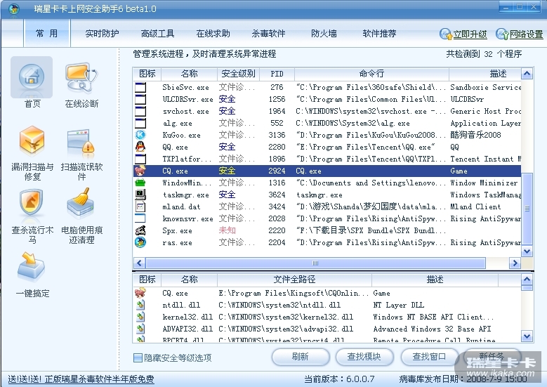 虽然现在由于瑞星占内存还是较大的...加上我是个游戏狂...所以不用瑞星了!