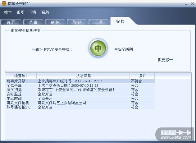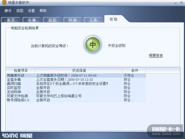 首页 » 个人产品讨论区 » 瑞星杀毒软件 » 瑞星杀毒软件2011 » 安检中计算安全等级为中安全级别,病毒库也升级到了最新版本了,病毒库升级显示不符合,怎么办?