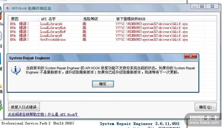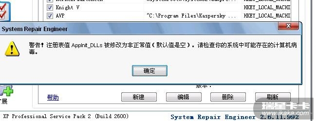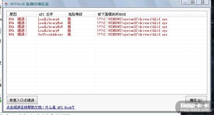 1、关于API HOOK和appinit_dlls提示错误问题:卡巴的,正常,不用修复