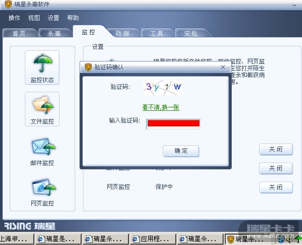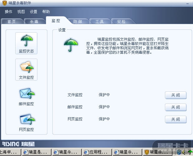 当你安装瑞星杀毒软件过程中选择安装的监控项,而在使用过程中未全部开启时就是黄色小伞,而全部开启时则是绿色小伞。