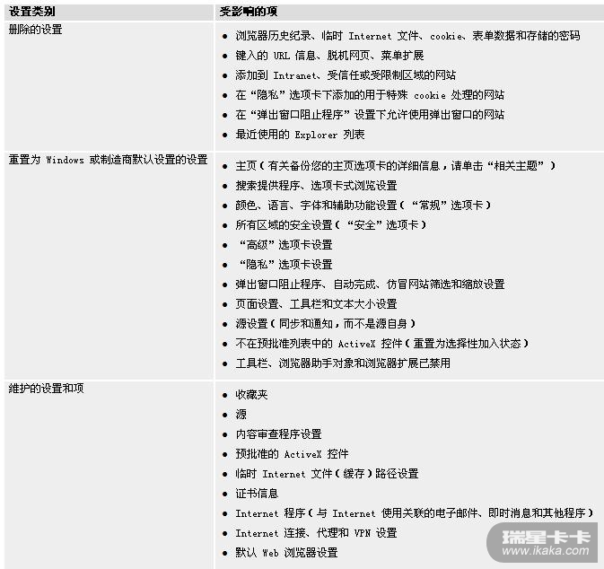 下表描述了重置 Internet Explorer 时对各种设置的影响。