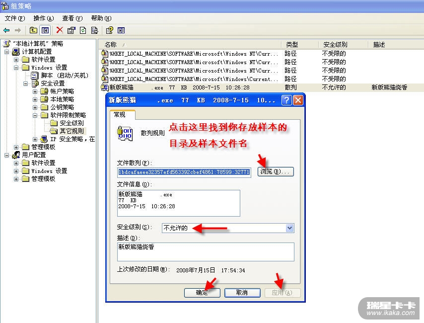 具体做法----在“软件限制策略”中添加针对此样本的“散列规则”