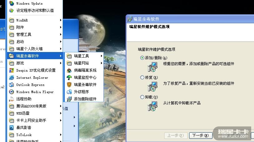 安装程序就是你第一次安装瑞星杀毒软件在计算机上说用的那个软件,修复方式如图