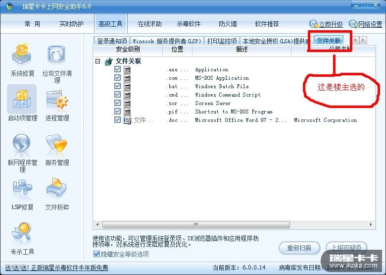 不管是点击卡卡6.0首页的“启动项管理”还是“高级工具”-“启动项管理”,右侧窗口出现的都是文件关联,而并非系统启动项