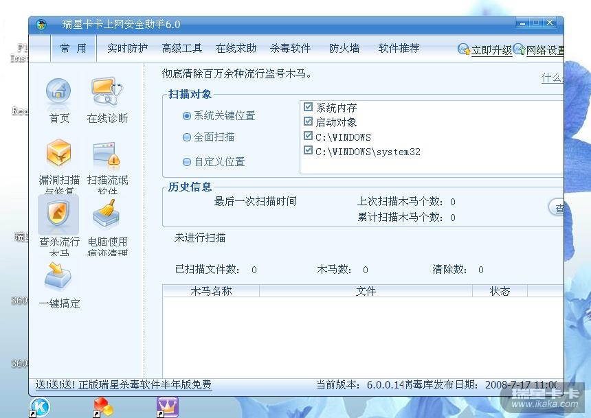 我刚安装了卡卡6.0,但出现的软件主界面的字体和安钮显示不完整.比如木马查杀只看到个查字,好像还有三分之一的界面没有显示出来,这是什么回事,请帮忙解决!!