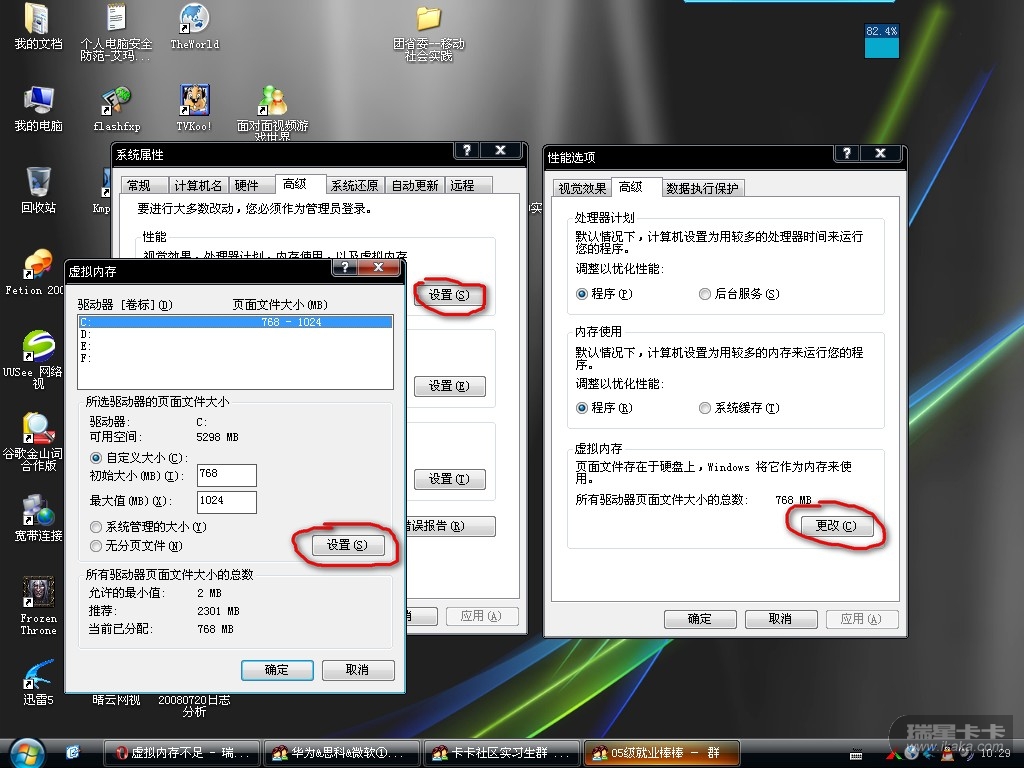 右击“我的电脑”,左键点“属性”→“高级”→“性能(设置)”→“高级”→“虚拟内存(更改)”→“自定义大小(设置)”根据你物理内存的大小设置为物理内存数值的1.5或2倍大小就行了。一般利用系统的默认大小就可以,要是系统经常提示你虚拟内存小,那你可以把数值设大一点,也不要太大哦,还要看你系统盘的剩余容量啊。当然,你也可以把分页文件“虚拟内存”转移到其他分区,点你要设置的分区,假如你想把分页文件转移到“d”盘,就点“d”,设置好虚拟内存的数值后点“确定”就行了(需要重新启动)。