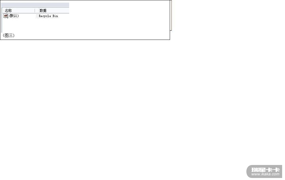 再选中该项,把右边的“默认”的键值设为“回收站”(图三),然后退出注册表。