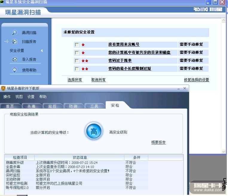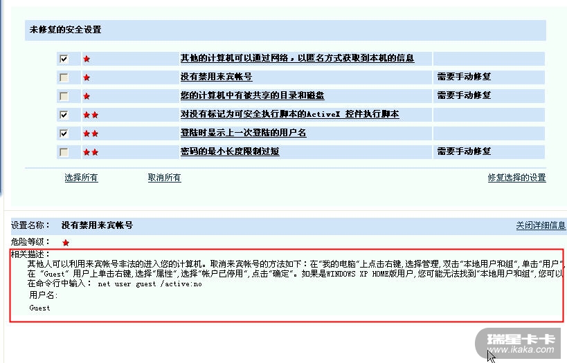 问一个问题:我用瑞星系统安全漏洞扫描,老是说我没有禁用来宾账户,我确认禁用了的呀!虽然我目前的安全等为高,但还想更完美!希望得到解决!谢谢!~