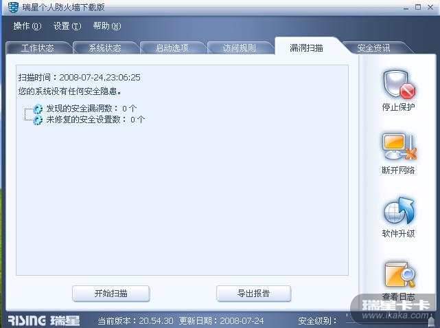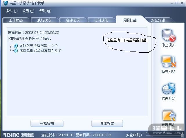 今天打开瑞星防火墙准备扫描下漏洞,发现:光是底下部分的开始扫描,框内右上角的漏洞扫描没了,也打不开另一个扫描界面!