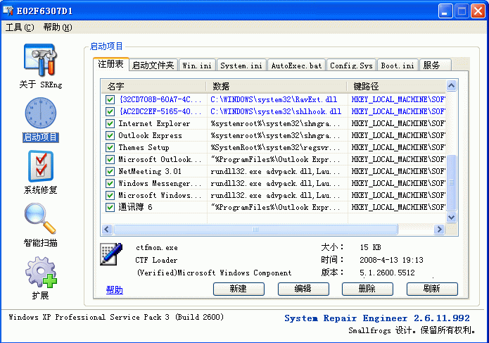 2.删除重启后使用SREng修复下面各项: 启动项目 -- 服务-- 驱动程序之如下项禁用:
