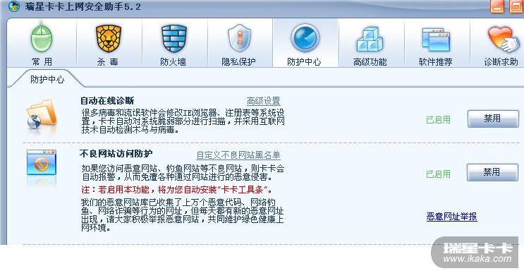 这个功能是打开的。而且提示说打开不良网站防护会自动安装卡卡工具条。。我的IE上没有卡卡工具条呢?IE7都这样?