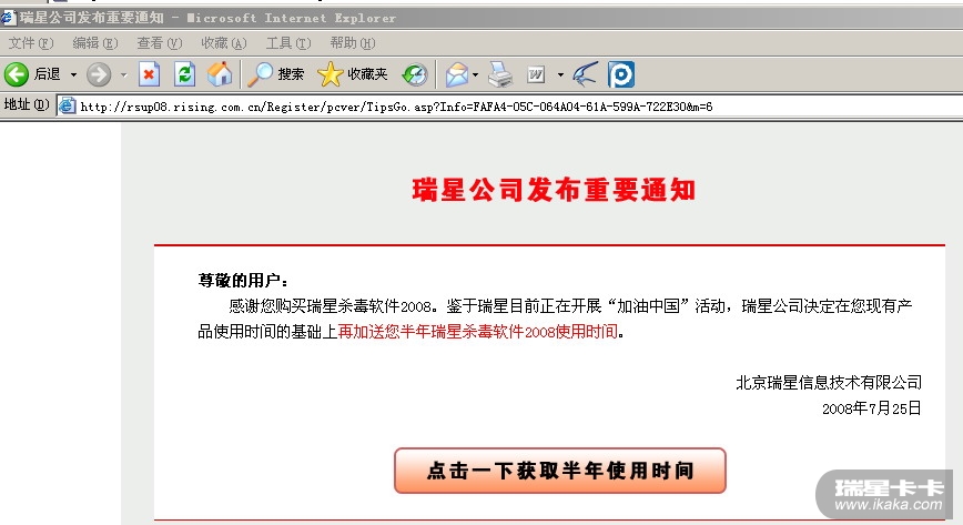- 尊敬的用户:恭喜您!鉴于瑞星目前正在开展“加油中国”活动,瑞星公司决定在您的瑞星杀毒软件2008免费6个月的基础上,将免费使用期延长至一年。