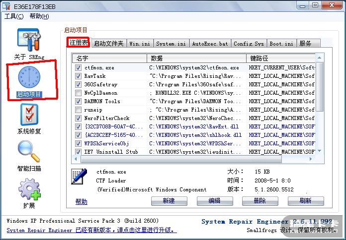 也可以用4楼的方法吧...楼主去下载一个SRENG...然后打开...有个启动项目...看图...在注册表那找到这个DLL的按删除应该就OK了吧...