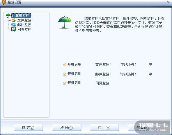 本人由于 想利用时间 做些试验,但是 瑞星的 实时监控 一直妨碍,就 先关闭了 瑞星的一些 实时监控 项目,当然 关闭的时候 要求输入 验证码,虽然麻烦 ,但是也显示出 瑞星的周全,很是赞赏。。。。可惜当我 再次 开启被关的 实时监控 项目时候,能及时 打开,但是 再次打开计算机后, 瑞星 的 实时监控 又恢复为 被关闭的状态, 即,上次 关闭后又 打开,只是 当时起作用, 关机后 又关闭了一些 实时监控 的项目。。。。本人重复 了很多遍 ,都没能 成功,《排除 病毒的作用,已经查毒了,且 升级几次了问题依旧》