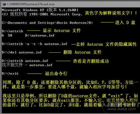 5. 如果能找到 autorun.inf 文件,就用: attrib -a -s -h -r autorun.inf ,这个命令,来去掉这个文件的隐藏属性。