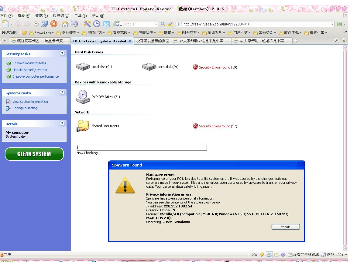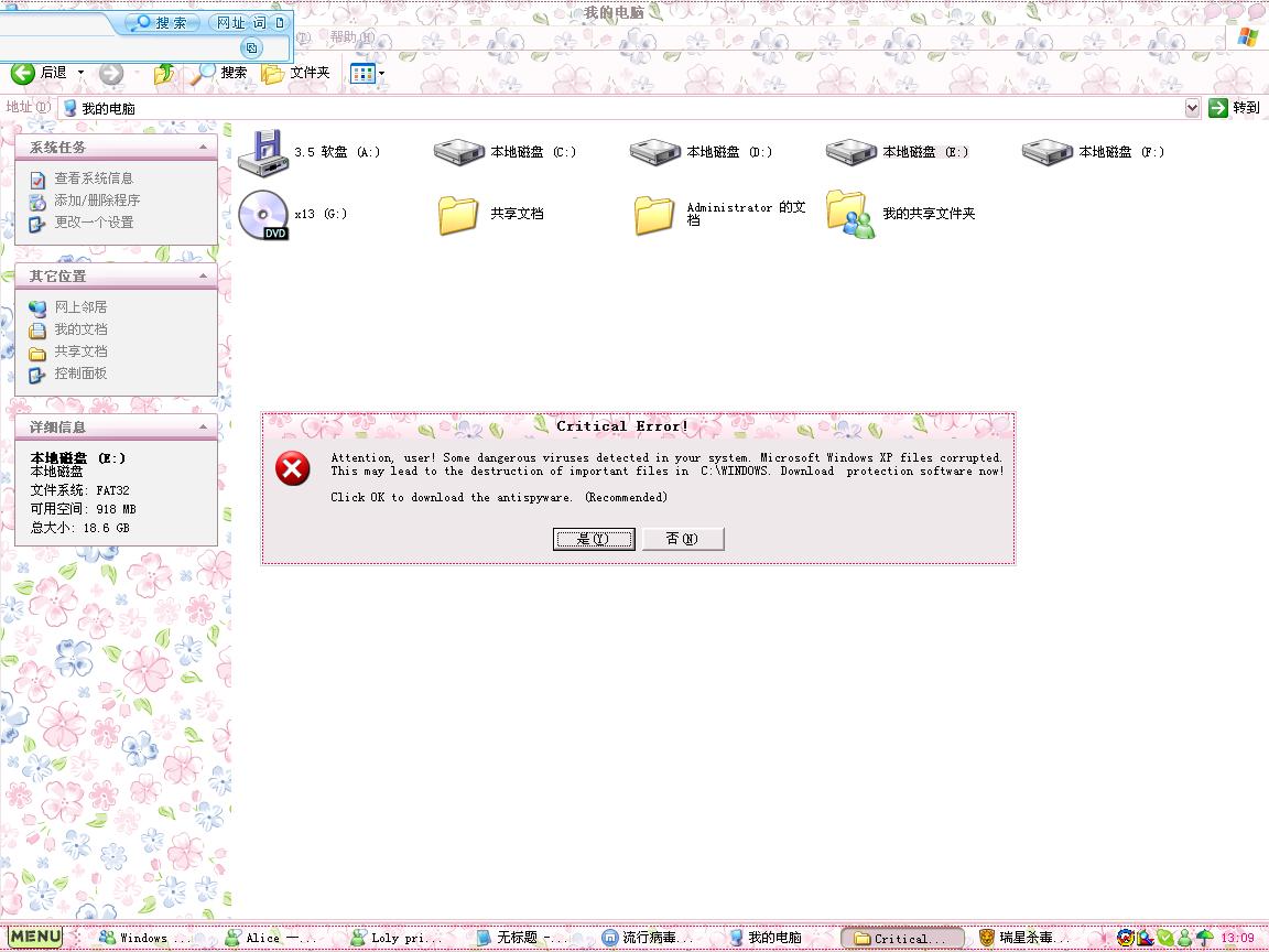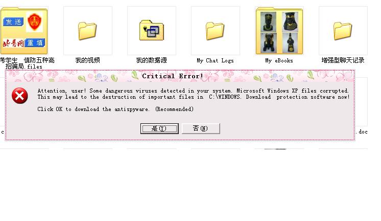 我的电脑三天前出现了这样的一个现象,当我打来任何一个文件夹时它会跳出来一个警告,如图 critical.jpg, 这时不论你按"确定" 还是按"取消" , 电脑都会自动打开IE 浏览器,打开这个网址: http://free-viruscan.com/id/4912933/4/1/, 在这个页面下边有这样的提示:
