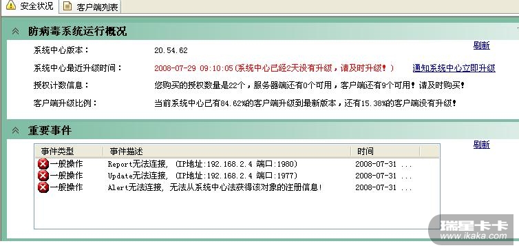 RAVALERT和RNREPORT连接不上,有可能是数据库损坏,可以给瑞星客服打电话,索取数据库修复工具。
