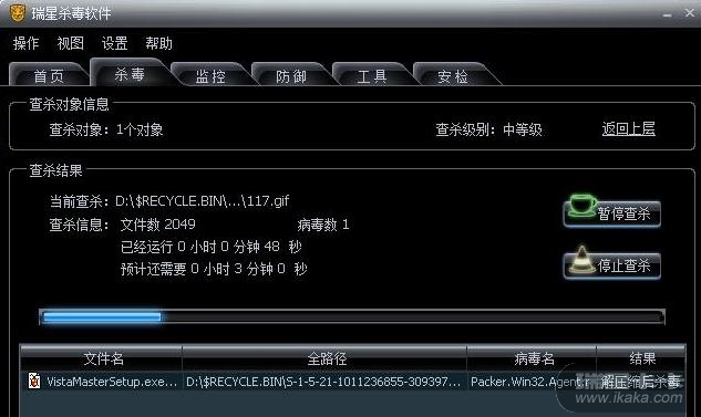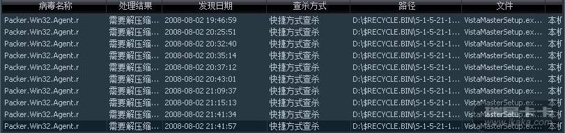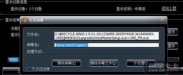 的时候瑞星又查出毒了,这次不在C盘了D却有了,路径是:D:\$RECYCLE.BIN\S-1-5-21-1011236855-30