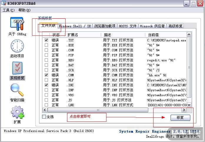 我的F盘出现了"文件关联错误"问题,我使用了系统自带的修复,弄了半天没有反应,也修复不了.我使用"瑞星注册表修复"也没有改变.