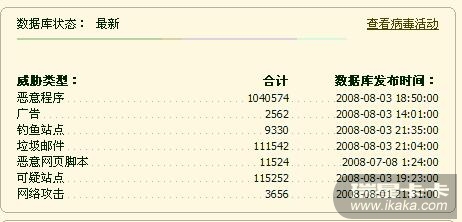 昨天看到卡巴09版本上市了,看到他里面的病毒库比以前描述很详细,病毒库还突破了100万,希望瑞星也能公布一些数据,数据能说服人,不过瑞星病毒分类不要按照卡巴的分类,他们分的有问题,应该按照木马,恶意软件,等等这种分类,这样比较清楚更符合中国人的习惯,真正让用户参与了解计算机的状况。这样更有说服力