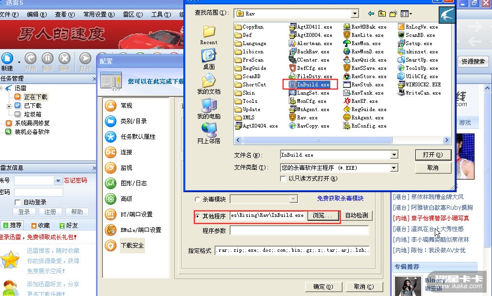 在迅雷的安全设置里,通过浏览添加杀毒软件安装目录下的InBuild.exe。