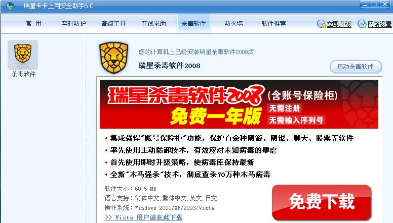 各位网友好!请问瑞星到底有没有免费2008版杀毒软件。难道所谓的----“免费”----只是-------“免费查毒”,不是免费杀毒