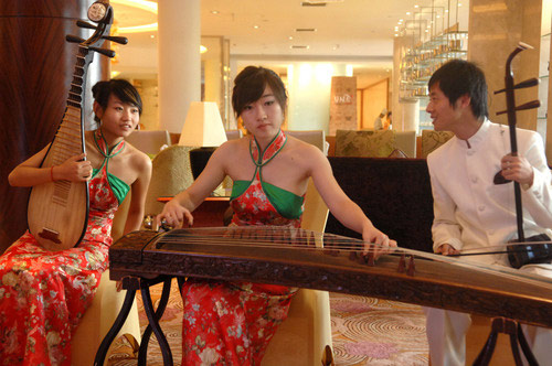 2008年8月5日,2008北京国际新闻中心大厅,五名身着中国传统服饰的年轻演员,在古香古色的中国风背景映衬下,用古筝、琵琶、二胡、阮等乐器,为前来北京报道奥运的中外记者弹奏中国民间乐曲,构成一道亮丽的风景。