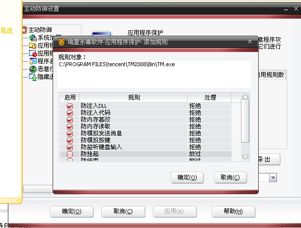瑞星杀毒软件——设置——防御设置——应用程序保护——添加——浏览到要保护的进程或者是程序——确定——
