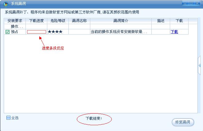 点击“修复漏洞”按钮后,下载进度条没有反应,但是却提示“下载结束”,咋回事?