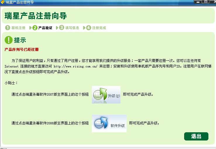 救救我吧 ,前几天我刚刚下血本买了个瑞星杀毒软件2008, 正常步骤安装完成后,就安心了。过了两天我去点击“自动升级”,结果它显示了个“瑞星产品注册向导”,我没有在意,因为我以前所用过的版本从来没有遇到这样情况,所以我就随便填写了下,到下午了,我又去点击“自动升级”,可是却升不了级,反而又蹦出了个《瑞星产品注册向导》,并给出了个提示,说我“产品序列号已经注册”, 而且不管你怎么点击都是升不了级,老是蹦出个这个注册框框,我的软件买来序列号未被开封,一切安装软件过程都是正常的,序列号也是对的,为什么现在又要搞个什么产品注册额? 老大,我招谁惹谁了啊,我一个奉公守法的良民,好不容易买了个正版杀毒2008,现在遇到这个问题是不知所措,点击后就是升不了