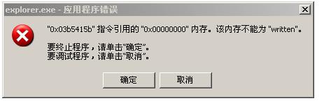请大家帮帮我,向各位求助。自从我前几天把病毒和木马清除完后我点击某些AVI文件就会出现这个问题,explorer.exe - 应用程序错误 0x3b5415b指令引用0X00000000内存 该内存不能为written,那些AVI文件又没有病毒,已经查过了,我是用瑞星2008正版的最新版以及瑞星卡卡6最新版和360安全卫士4.3版来杀毒以及清除木马的。我是用WINDOWS XP-SP2的。