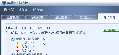 1、用瑞星防火墙进行漏洞扫描,发现的是5个漏洞。如图: