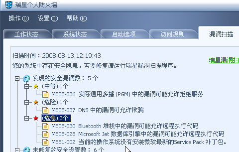 3、用瑞星防火墙进行漏洞扫描后发现的5个漏洞如下图,其中并没有发现用瑞星杀毒软件进行漏洞扫描时发现的漏洞。
