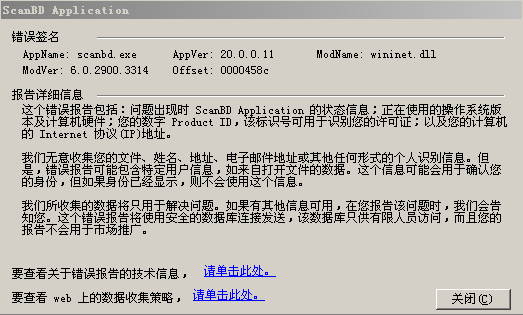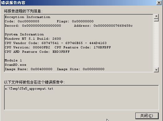 在楼主的第一幅截图中的“请单击此处”在打开的界面中可看到相应的错误提示,同时该错误日志将被保存到 临时文件中(形如:C:\DOCUME~1\ADMINI~1\LOCALS~1\Temp\1901_appcompat.txt 其中红色部分文字应每次均会产生变化),请将该文件压缩后跟帖上传