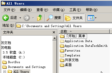 4、在打开“C:\Documents and Settings\All Users”文件夹后,并没有版主所说的“C:\DOCUME~1\ADMINI~1\LOCALS~1\”文件夹,见图3