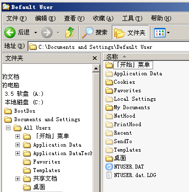5、在“C:\Documents and Settings”中的第二个“C:\Documents and Settings\Default User”文件夹中发现了“Local Settings”文件夹,如图4