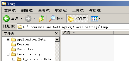 7、同样,在“C:\Documents and Settings”中的第三个“C:\Documents and Settings\sj”文件夹中也发现了“Local Settings”文件夹,打开该文件夹,并打开里面的“TEMP”文件夹,里面是空的,没有形如“????_appcompat.txt”的文件,如图6