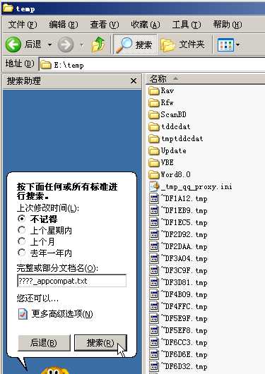 该图中下面框内提示中给出了形如“????_appcompat.txt”文件的路径是在“e:\Temp\15e5_appcompat.txt”下,于是笔者到e:\Temp\下去找形如“????_appcompat.txt”的文件,如图8