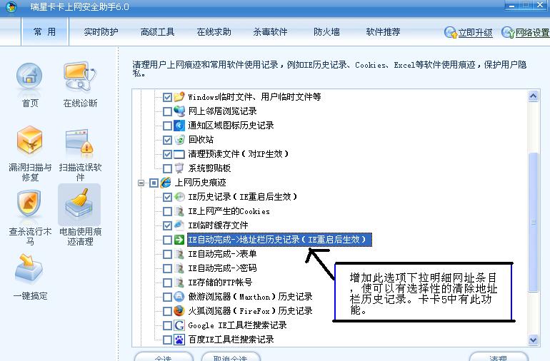 即在6中的“电脑使用痕迹清理-----上网历史痕迹------IE自动完成--地址栏历史记录(IE重启后生效)”下面增加明细网站地址,有助于有选择的清除不常用的网址!