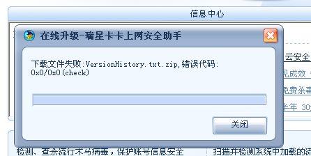 卡卡6.0升级的时候老是报"下载文件失败:kmon.dll.zip,错误代码:0X0/0X0(check)",不知道为什么,从新下载后安装后又出现了这个问题.