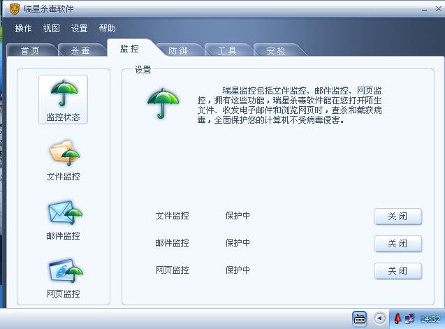 刚才瑞星杀毒软件升级后,也是绿伞变红(以前也曾出现过几次),点击右键打开所有监控不起作用,而在主界面却显示全部启用,是什么原因?另20分钟前本想发表帖子,上传截图的,但打开网页特慢(其他网页一点即开),且发贴时找不到服务器,怪!!!