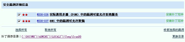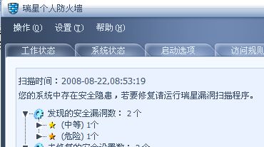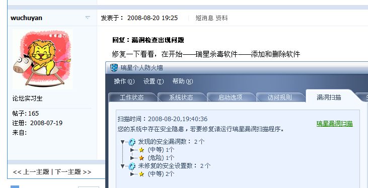 今天用瑞星防火墙进行漏洞扫描并安装补丁,共进行了5次(包括用20.58.10和20.58.21版本)都出现相同的问题,安装完成后扫描仍说有漏洞,重启也是一样。
