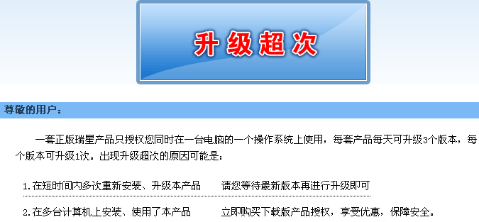 昨晚,我打算将台式机上瑞星杀毒软件由20.58.22升级到20.58.32,可是每次升级不是出现“网络连接限制请重新选择升级时间”,就是在“复制文件”后莫名其妙地消失了。今早,我早早起来准备升级却又弹出“单机版升级超次”的网页(如下图),想请教一下:出现我这种情况该怎么办?