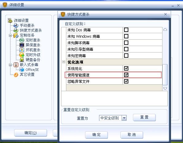 同意楼上的,如果不想要智能提速可以关闭。在详细设置中,在所需的查杀方式中有一个自定义,点一下里头有一个优化选项,将智能提速勾去掉然后按确定即可。