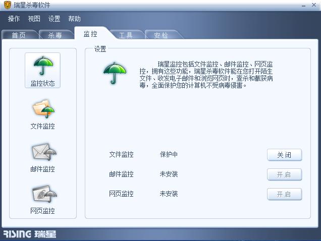 我的瑞星在64位的vista下面只能开启文件监控,邮件监控和网页监控都提示未安装。
