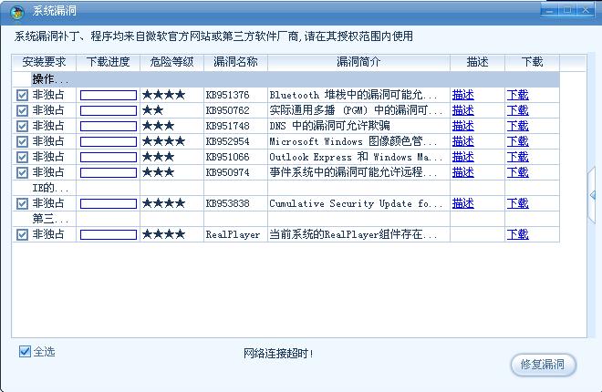 最近我的系统漏洞不能修复了,用卡卡和防火墙的都不行,用迅雷单独下载也不行。兔子和QQ的都试过了。以前都可以的。网络连接是正常的。