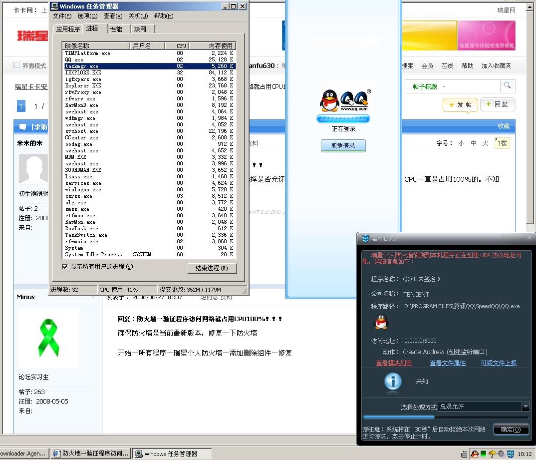重新描述问题,就是当有程序需要访问网络。而防火墙需要判断时,在访问网络的时候。大概有5-10秒的时间CPU是占用100%的。等过了这几秒,防火墙才弹出是否允许此程序访问网络的提示,弹出提示后就正常了。