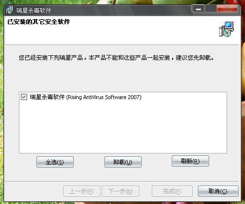 我昨天还原了下c盘``但瑞星就不能升级了``说要我删除瑞星杀毒软件(rising antivirus software 2007) 但我点卸载却没有动静