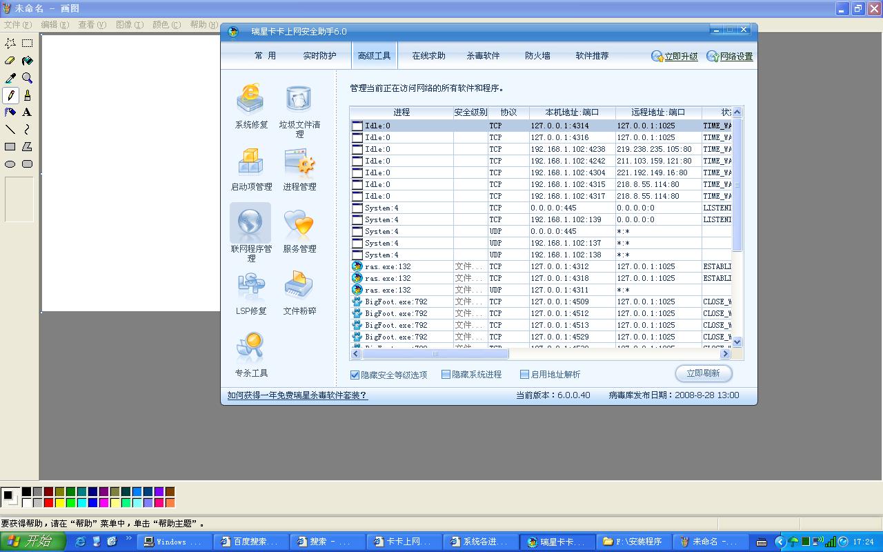 我觉得网络比较卡-->我使用瑞星卡卡的联网程序管理-->发现大量的idle 0和idle 4的程序。。本机端口都貌似不是系统端口,目标IP大部分是外网IP。。附件为断网后不运行时候的状态