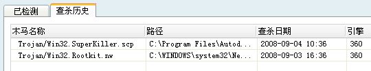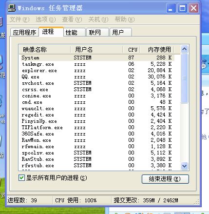抓图了,你看看。一张是cpu占用率100%的情况。一张是用360卫士扫到的木马,我在360扫到并清除木马后电脑都正常运行的,并且开任务管理器看cpu占用率是正常的,并且没有看到一个叫system的任务进程。第一次就是昨天下午16:36,电脑正常运行后,我就开始安装瑞星,先装的瑞星防火墙,然后升级,没有问题。然后再装瑞星杀毒软件,安装的时候速度明显很慢,装完以后升级也很慢,到最后没法完成。卡条一直无法完成。于是强行到c盘删除瑞星杀毒软件目录(因为使用添加/删除程序不行,点击后无反应)。然后当晚有事就关机没动电脑。然后今天上午10点30用360卫士又查出木马,删除后,重装瑞星杀毒软件(这段时间防火墙一直可以正常使用,并且我还做了漏洞扫描及修复),这次安装及升级都能正常完成。然后一直到了11点30左右,就是瑞星每天正常自动杀毒的时间,杀毒软件自动运行查毒后,我发现电脑又开始运行慢下来,我马上开任务管理器看,发现system又出来了,这时候cpu占用率又100%了。然后瑞星杀毒软件就无法关闭了。